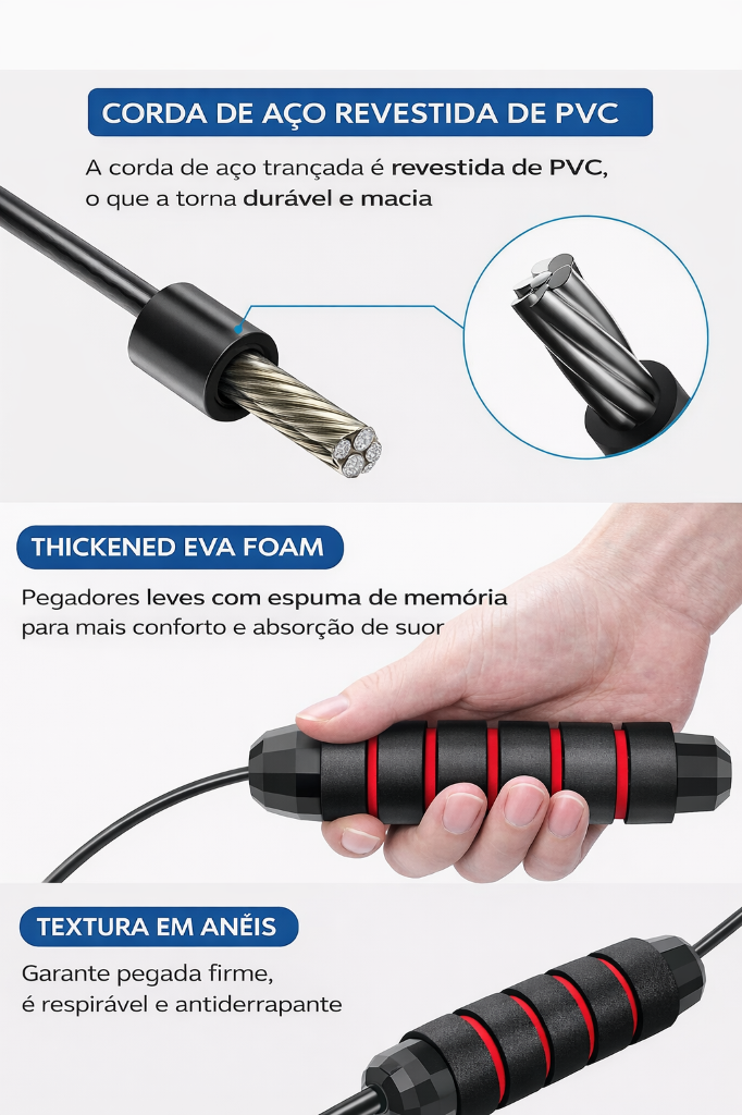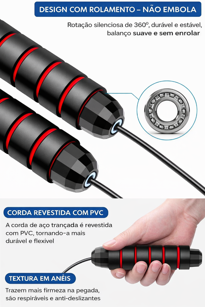 Construída com rolamentos de esferas de alta qualidade, a corda de pular proporciona um treino de salto confortável.