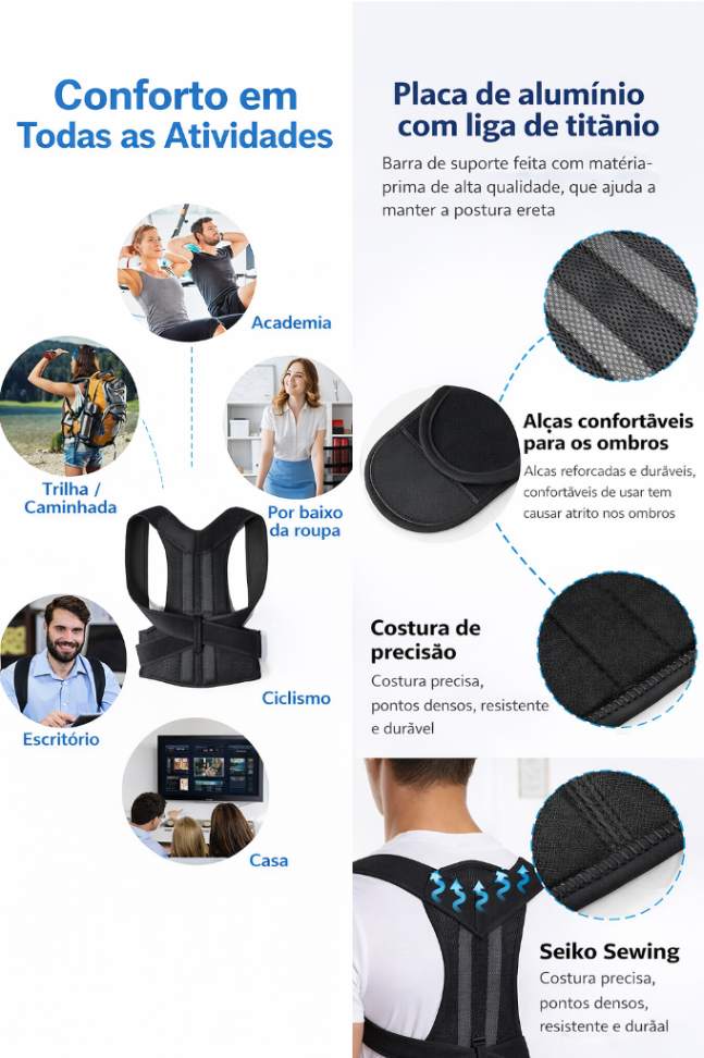 O design de suporte ajuda a corrigir a postura errada das costas e ombros.